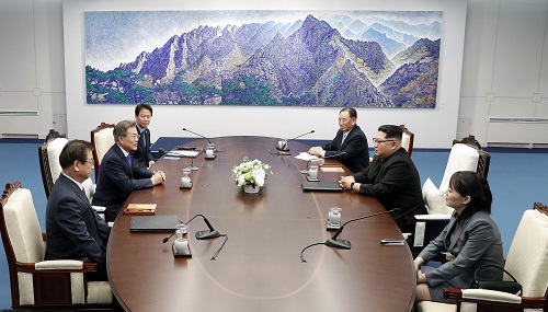 2018年4月27日,韩国总统文在寅(左二)和朝鲜国务委员会委员长金正恩(右二)在板门店举行会晤。/新华社发