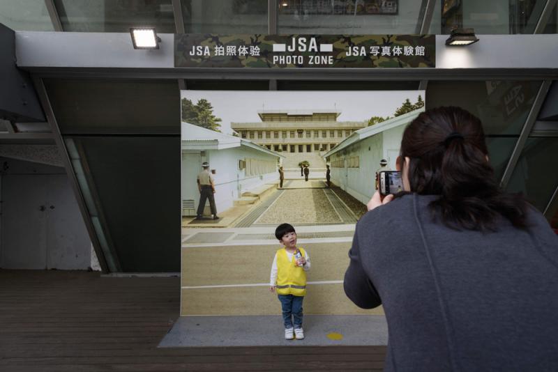 图:一名儿童在板门店和平村的背景板前拍照\法新社