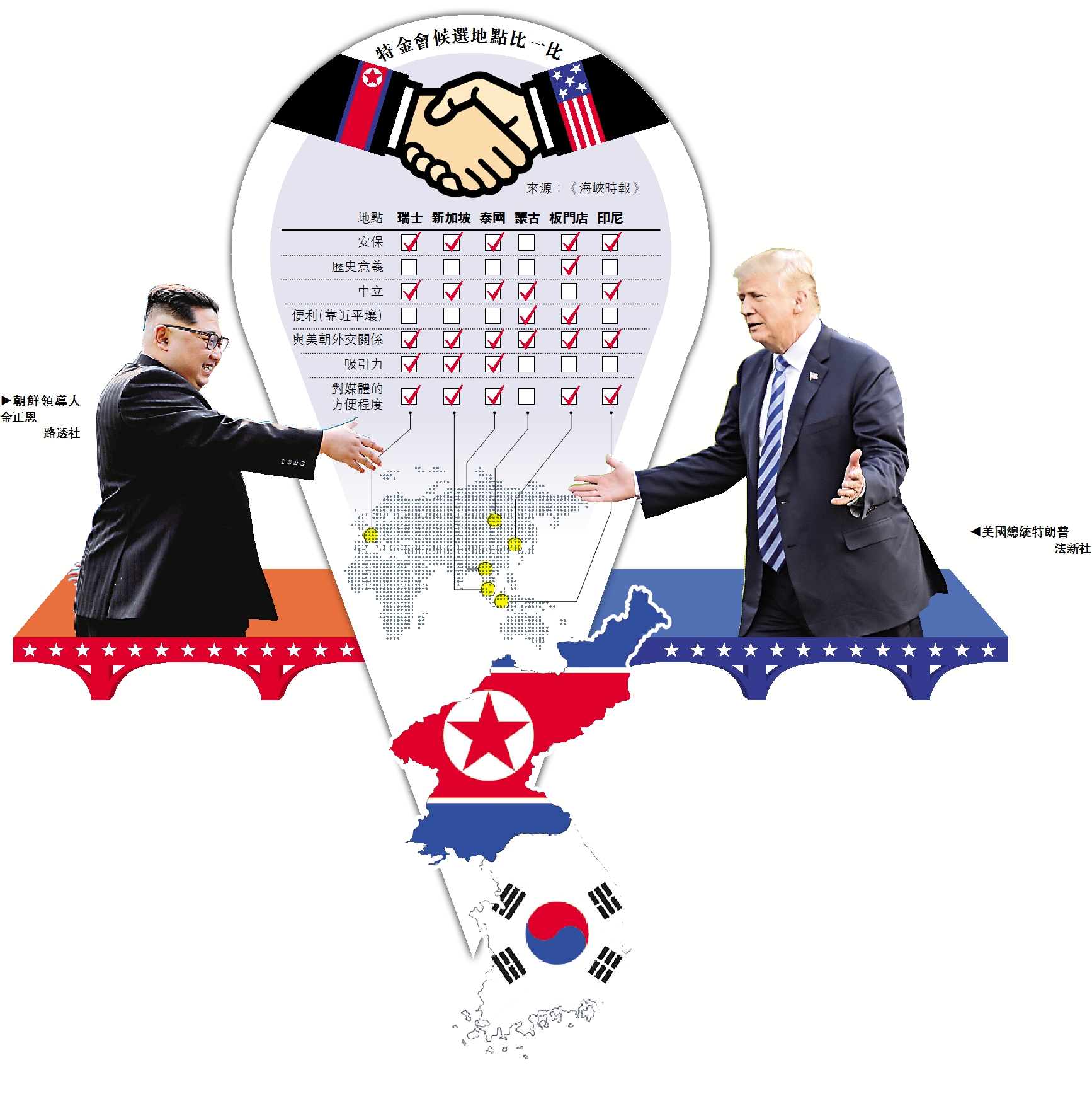 韩国《朝鲜日报》5日引述华盛顿外交消息人士透露,喜欢戏剧性效果的特朗普,虽然早前暗示有可能在板门店召开美朝峰会,但新加坡被华府视为是最有可能举办特金会的地方。报道称,特金会很可能于6月第3周在新加坡举行。由于6月8至9日在加拿大召开G7峰会,因此特金会可能于6月第三周,即6月9至15日之间举行。