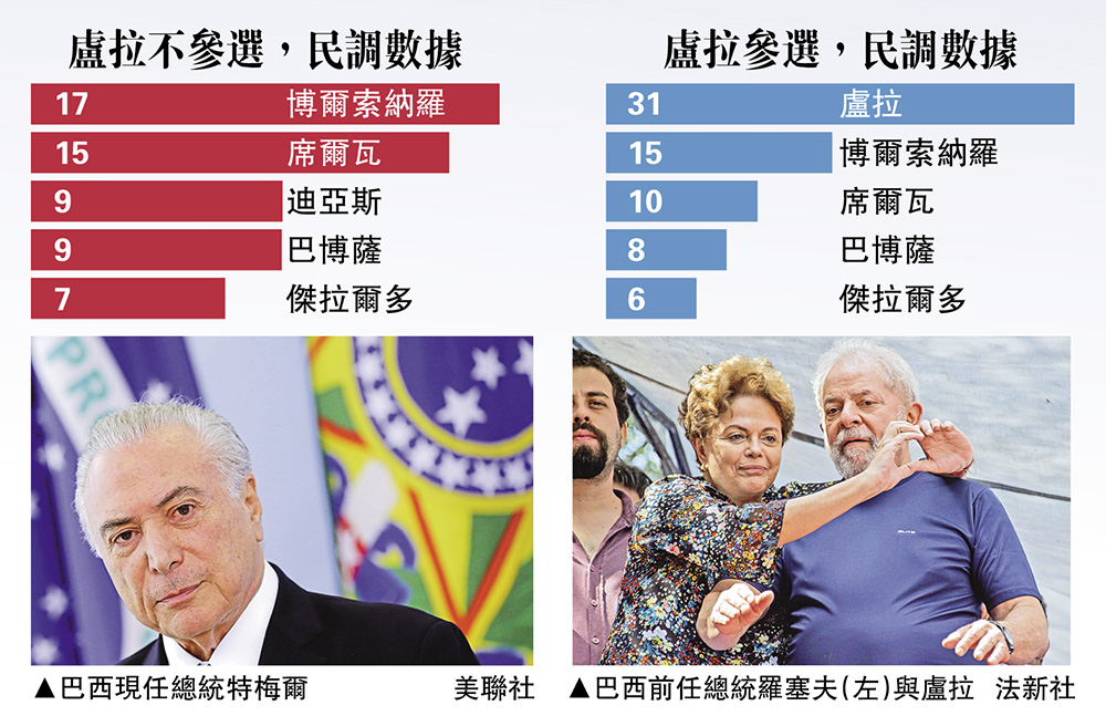 卢拉卸任时支持率高达80%,根据4月的民调显示他在选民中的支持率仍有30%,在所有潜在总统候选人中高居榜首。但根据巴西《清白档案法》,卢拉一旦入狱将没有资格参与竞选。