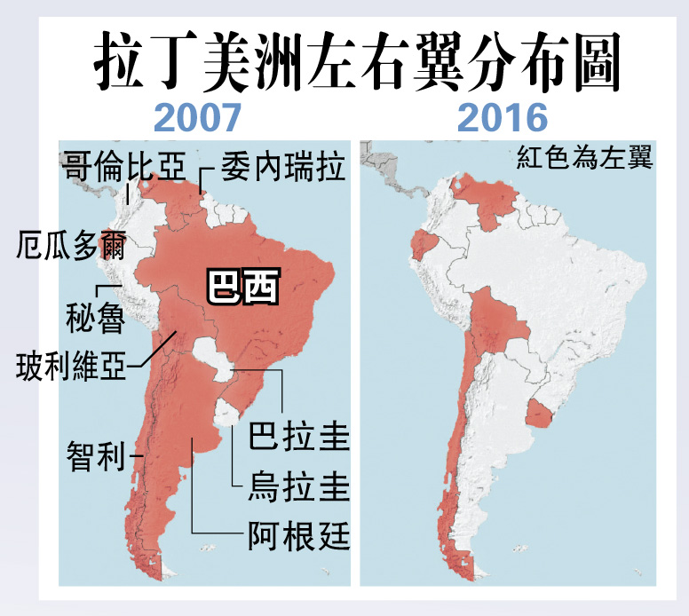 据法新社报道:自20世纪末期起,拉美掀起了“粉色浪潮”,多国左翼政党纷纷登上政治舞台,先后赢得执政权,巅峰时期拉美大多版图都被粉色覆盖。但自2015年年底起,多位左翼领导人接连选举失败、陷入贪污丑闻、遭到弹劾,拉美左翼的黄金年代一去不復返。再加入上月巴西前任总统、左翼运动的代表人物卢拉被判入狱,拉美左翼元气大伤,似是走向末路。