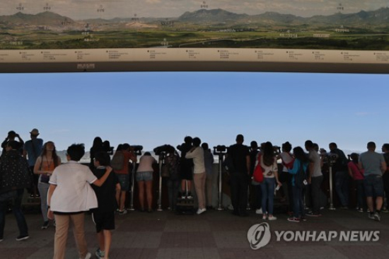 资料图片:从都罗山瞭望台遥望非军事区和开城工业园的各国游客们(韩联社)