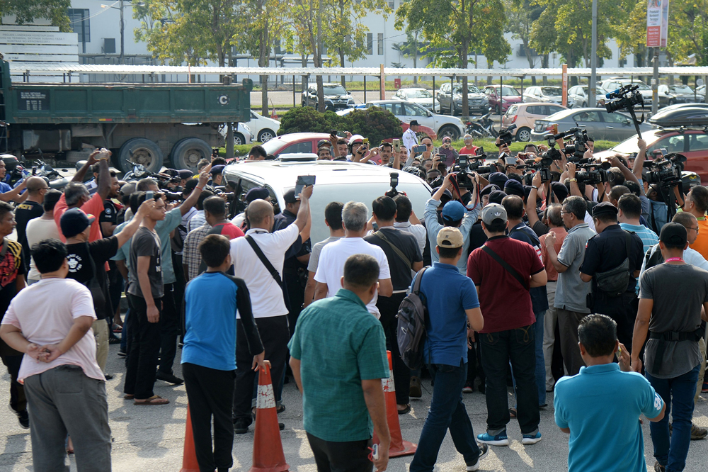 图:大马民众12日早上在机场围堵一辆汽车,怀疑车上载有纳吉布夫妇/法新社