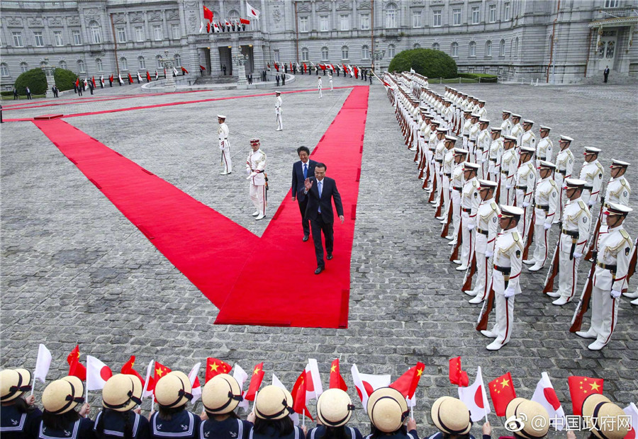 李克强总理当地时间5月9日下午出席日本首相安倍晋三在东京赤坂迎宾馆为他举行的隆重欢迎仪式。两国领导人登上迎宾台,军乐队先后奏响中日两国国歌。百余名日本儿童挥舞着两国国旗欢迎中国总理的到来。随后,李克强在安倍陪同下,沿红地毯检阅仪仗队。(图:中国政府网)