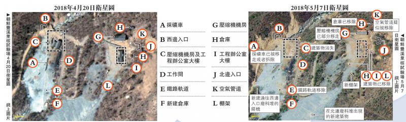 该报告指出:“和(4月20日)上一次的分析比较,(丰溪里核试验场)北部、西部和南部的几栋关键建筑已被夷为平地……部分采矿车轨道似乎也已经拆除。此外,一些车子看起来像是被推倒或拆卸;另有几个小屋与附属建筑也已经拆除。”
