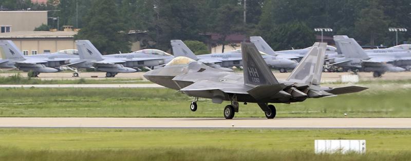 图:参与美韩“超级雷霆”军演的F-22猛禽战机/美联社