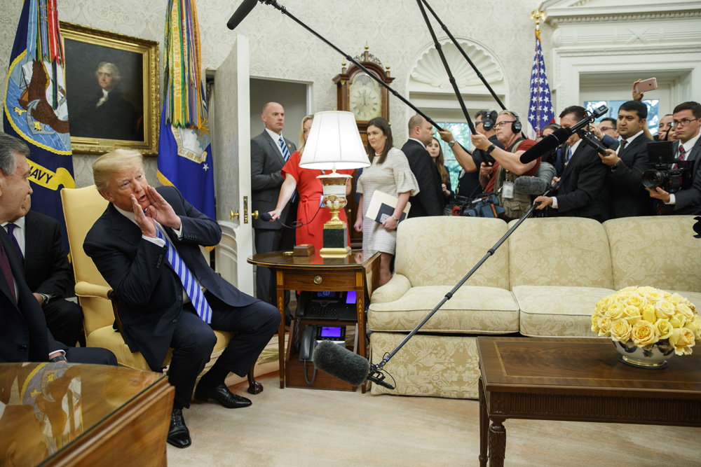 图:美国总统特朗普5月16日在白宫椭圆形办公室说未获峰会取消的通知/美联社