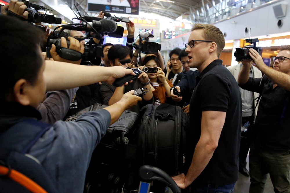 图:CNN记者雷普利22日在北京机场被同行包围採访\路透社