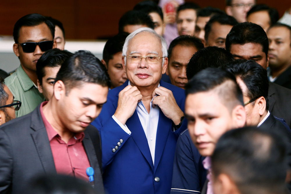 图:马来西亚前总理纳吉布(中)22日离开反贪委员会总部\路透社