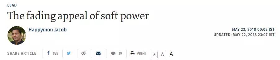 《印度教徒报》网站5月23日刊载印度尼赫鲁大学国际问题研究学院国际政治、组织和裁军中心副教授哈皮蒙·雅各布题为《软实力的吸引力日益减弱》的文章称,近期的战略决策表明印度的外交政策出现了后范式转变。它对权力和影响力的追求似乎超过了该国传统的行为规范和原则性立场。这一转变是否会对印度的国家利益产生负面影响还没有定论。