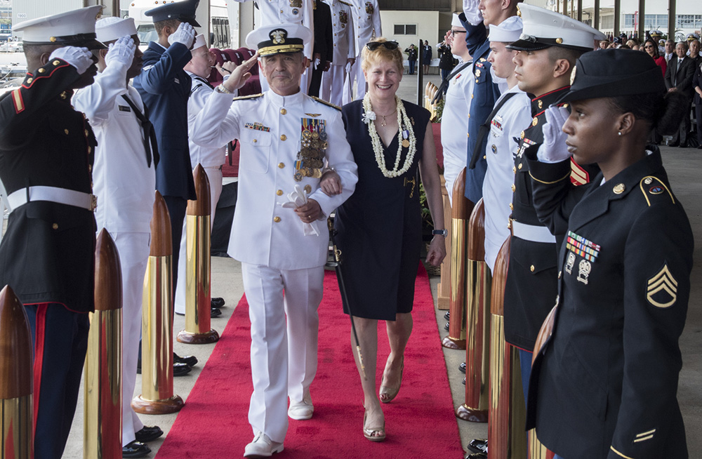 图:卸任太平洋司令的哈里斯偕同妻子5月30日抵达夏威夷的太平洋司令部总部\美国海军官网