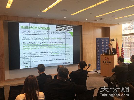 日前,以色列驻美国大使馆的经济事务参赞Eran Nitzan率领以色列贴现银行纽约分行总裁Uri Levin、以色列出口与国际合作学会主席Adiv Baruch以及以色列五大律所之一的Shiboleth LLP合伙人Alon Harnoy等,专程到美国中国总商会举办主题为“全球伙伴与全球创新:中国和以色列”投资论坛,向在美中资企业介绍以色列的投资环境和科技发展优势,欢迎中资企业到以色列开展投资与经济合作。