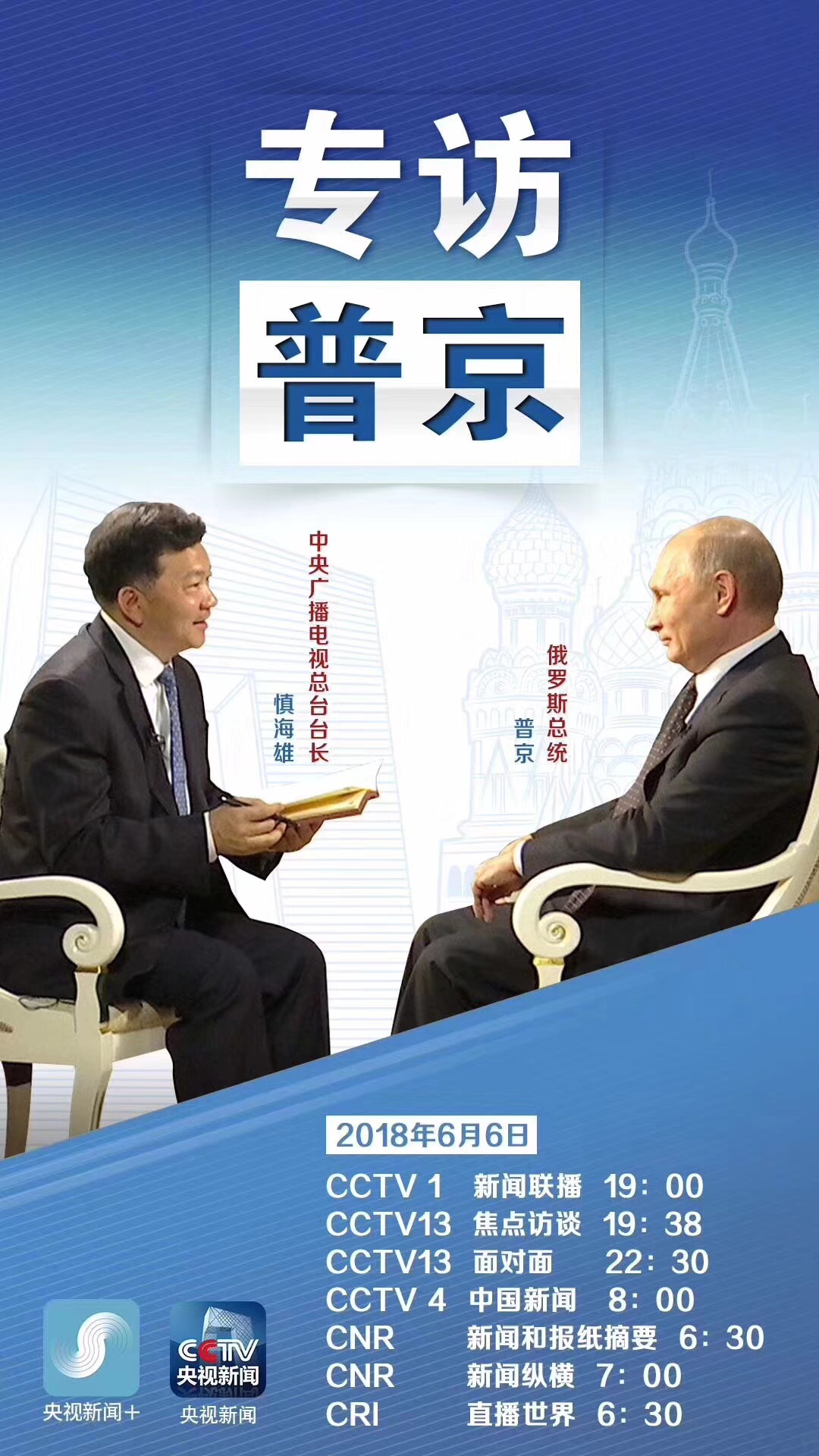 2018年5月31日,俄罗斯总统普京在克里姆林宫接受了中国中央广播电视总台台长慎海雄的独家专访。这是普京于5月7日就任俄罗斯新一届总统后首次接受国外媒体专访,也是他首次在克里姆林宫接受中国媒体专访。