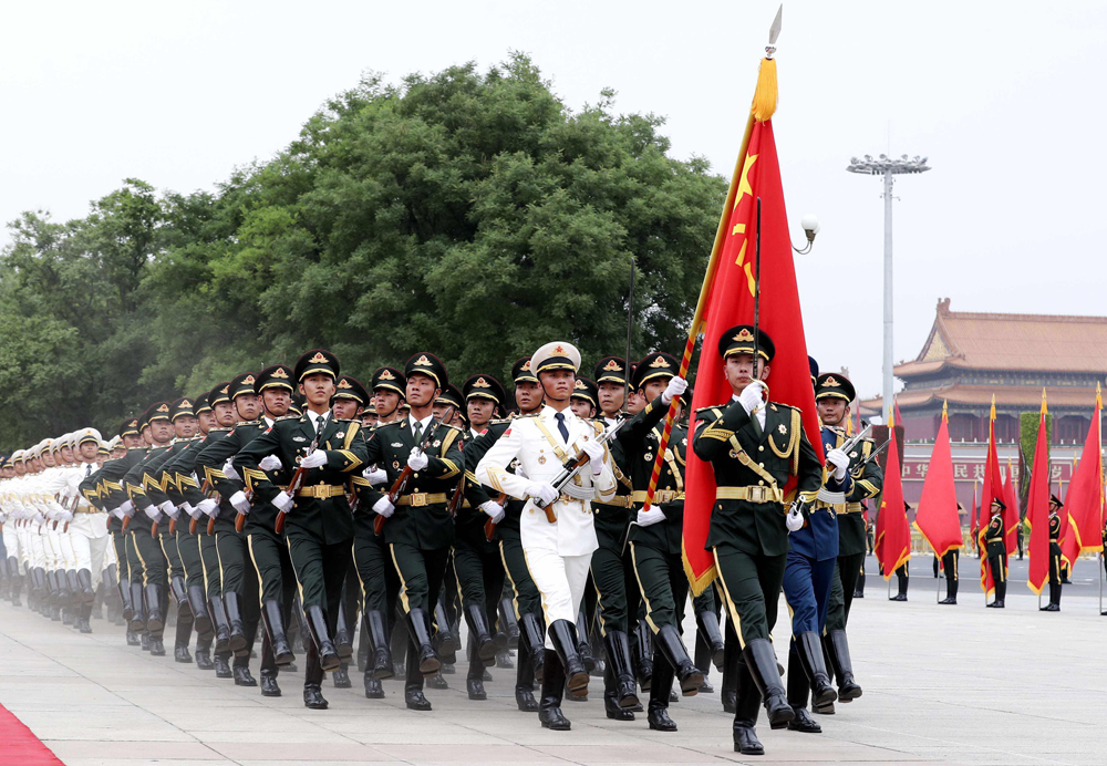 图:改革后的国事访问欢迎仪式6月6日首次启用。图为三军仪仗队首次增加女兵方阵\中新社