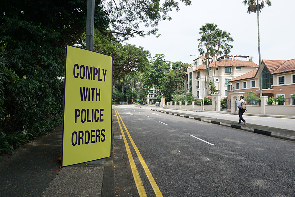 图:10日下午,香格里拉酒店附近车辆稀少,但随处可见遵循警方管制的黄色警告牌\大公报记者张佳晴摄