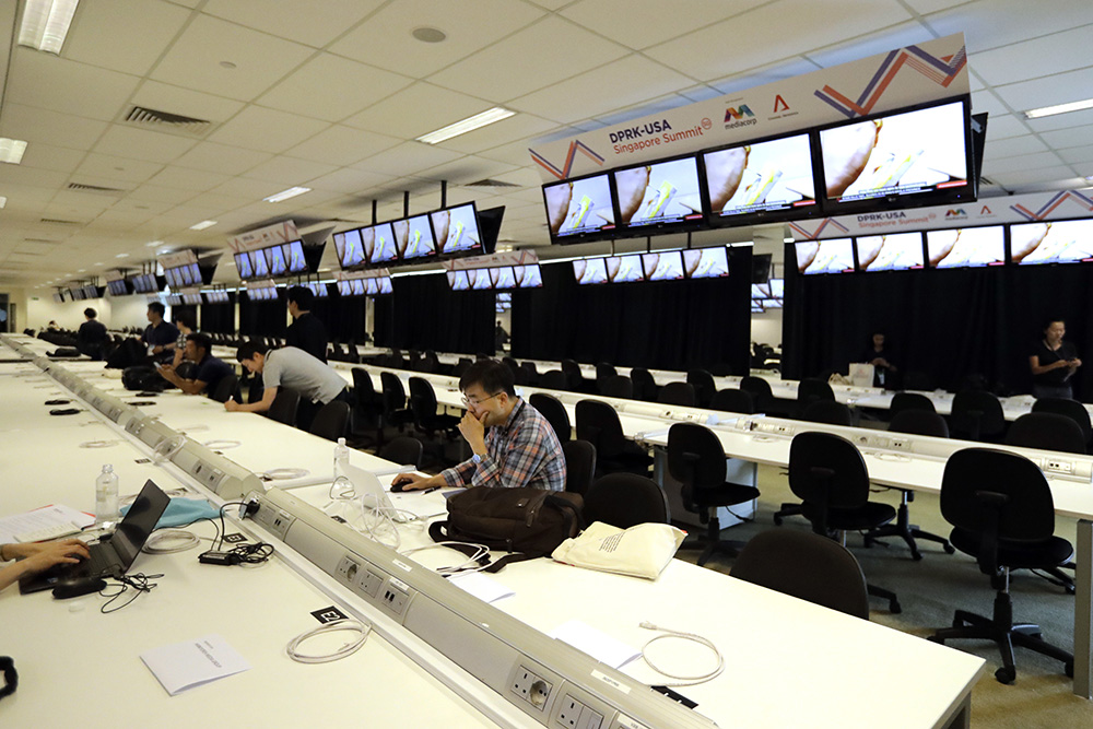 本次报道“特金会”的媒体中心设在金海湾的F1维修大楼,6月10日上午10点开始对登记传媒开放,13日晚间10点关闭,其间24小时开放。据悉,此次超过2500名记者登记进入媒体中心,其中80%为新加坡外的国际媒体。“特金会”也是新加坡最大型的一次传媒报道事件。