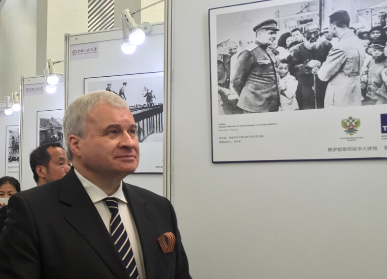 杰尼索夫大使是在出席纪念世界反法西斯战争胜利70周年图片展开幕式时作出上述表示的。图片展由俄罗斯驻华使馆与人民大学共同举办。