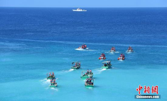 1月6日,海南省三沙市在西沙永兴岛海域进行海上综合行政执法演练。图为由海警、渔政和民兵执法力量组成的编队进行执法演练。中新社发 侯坤/摄
