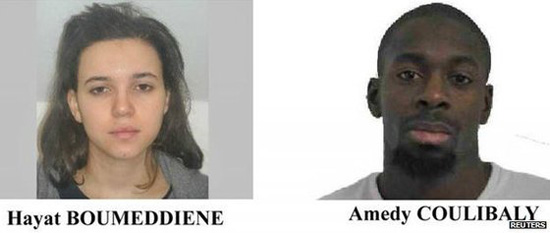 哈亚特·布迈丁(左)提前离开法国,已经潜入叙利亚。她是巴黎超市劫持者库利巴利(右)的女友。