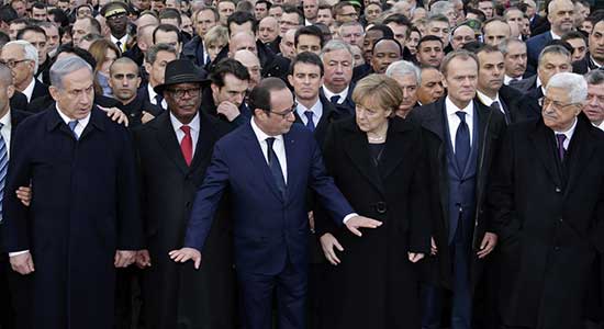 法国总统奥朗德、德国总理默克尔等全球60多名政要,手挽手共同走在巴黎街头,宣誓团结一致对抗极端暴力。引人注目的是,以色列总理内塔尼亚胡和巴勒斯坦国总统阿巴斯、波兰总统波罗申科和俄罗斯外长拉夫罗夫都共同出现在游行现场。这是以巴领导人4年以来首次出现在同一公开场合。