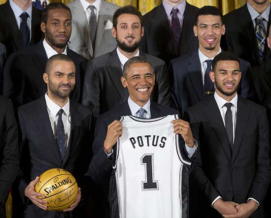 图:美国总统奥巴马(前排中)12日在白宫接见NBA圣安东尼奥马刺队队员/美联社