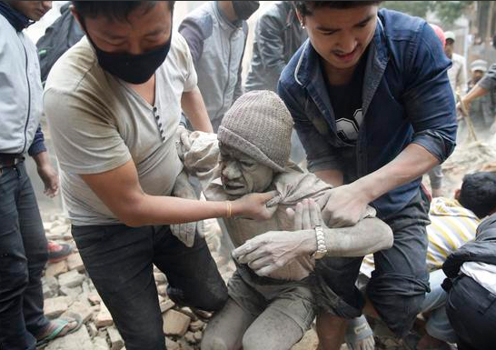 2015年4月25日14时11分,尼泊尔发生8.1级地震,震源深度20千米。西藏地区震感明显。路透社报道,尼泊尔警方表示,因地震遇难人数已经上升到876人。16名中国公民确认遇难。图为一名男子被从废墟中救出。