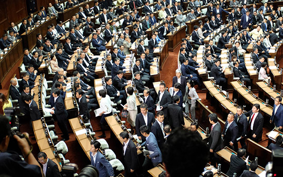 图:日本在野党议员16日在表决前集体离席抗议/路透社
