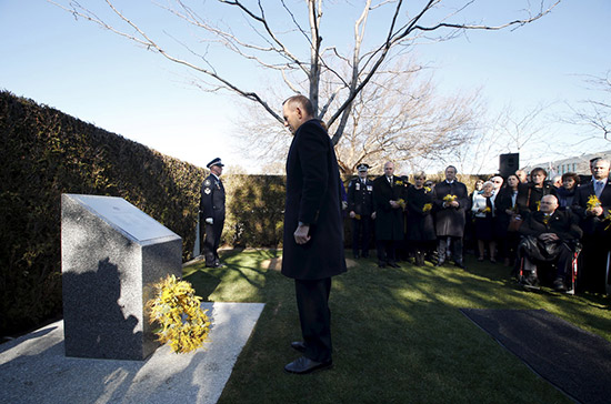 在澳洲首都堪培拉,刻有死者名字的纪念碑17日揭幕,主持揭幕仪式的澳洲总理阿博特与妻子献上花圈致意,约120名死者家属出席仪式,一年的时间并未能冲淡伤痛,他们含着泪摆放献给已故亲友的鲜花。