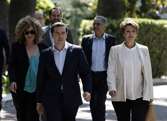 图:希腊总理齐普拉斯(左二)18日率领新内阁离开总理官邸/美联社
