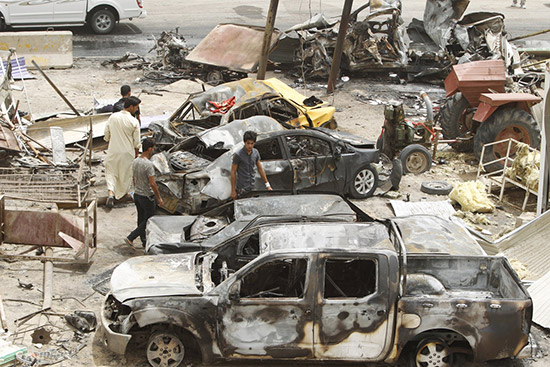 图:伊拉克汗拜尼萨阿德镇的市场17日遭遇炸弹袭击,现场多辆汽车被毁/路透社