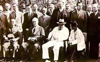 图:《波茨坦公告》要求《开罗宣言》的条件必须实施。图为开罗会议期间,美国总统罗斯福(中)、英国首相邱吉尔(右)和国民政府主席蒋介石(左)等合影资料图片