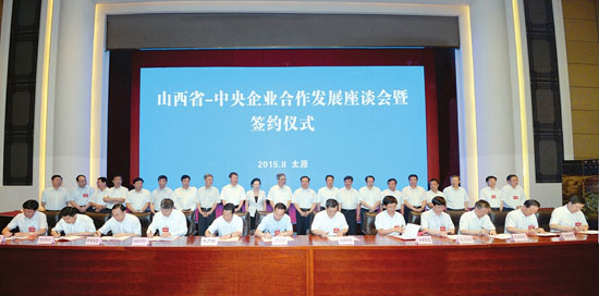 8月29日上午,2015年央企山西行活动正式启动,山西省—中央企业合作发展座谈会暨签约仪式在太原举行,山西省政府与7家央企签署战略合作协议,部分中央企业与山西省属企业签署9项煤电联营合作协议。国务院国资委主任张毅、山西省委书记王儒林出席并讲话。省长李小鹏作主旨介绍。山西省委领导和58家中央企业负责人出席座谈会暨签约仪式。