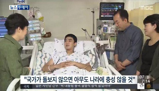 韩国总统朴槿惠6日探望了在“地雷事件”中受重伤的两名韩国士兵。(韩国MBC电视台截图)