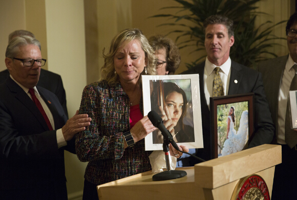 图:梅纳德的母亲在法案通过后出现在公众面前 美联社