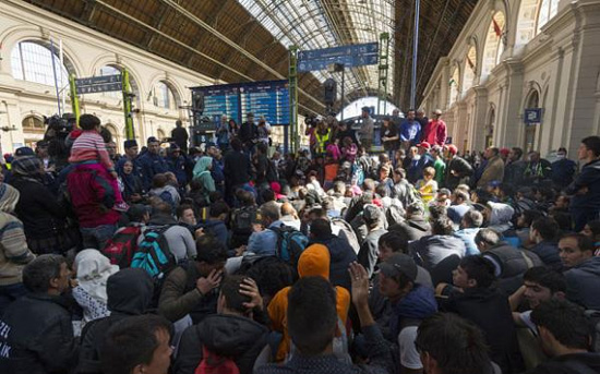 在布达佩斯火车站等待前往慕尼黑的难民队伍
