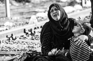 9月14日,在靠近塞尔维亚北部边境城市霍尔戈什的塞尔维亚和匈牙利边境地区,一名难民抱着孩子哭泣。新华/法新