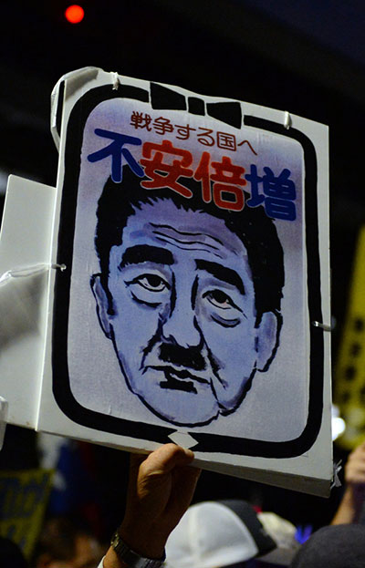 当晚,来自日本全国各地各个年龄层的众多民众手持荧光棒与各种反战、反安倍标语包围了国会,国会在野党议员也加入集会者行列。抗议民众高呼口号,要求“安倍下台”,“坚决反对强行表决通过安保法案”。