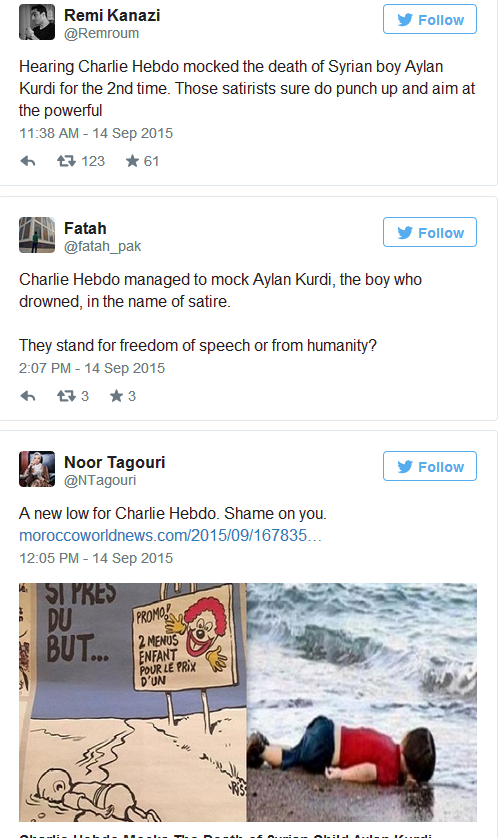 推特网友也对此纷纷表示谴责,不少人表示,先是对穆斯林表示不敬,现在又这样恶搞遇难的小艾兰,《查理周刊》的这种行为实在是让人感到不齿。还有人担心,查理的调侃很可能再次引发激进分子的报复。