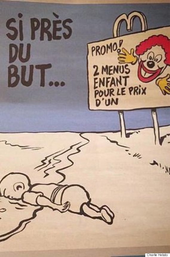 据赫芬顿邮报9月14日最新报道,来源标注为《查理周刊》的两张漫画在社交媒体热传,居然恶搞了小艾兰遇难的照片。一张题为《几近成功》(So close to his goal)的漫画画着小艾兰脸部朝下埋在沙中,旁边画着麦当劳的快乐儿童餐广告,上写着“两份儿童餐,只要一份的价格”(Two children's menus for the price of one)。