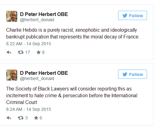 美国黑人律师协会会长、华盛顿特区大都会警察局副局长Barrister Peter Herbert在推特中写道:《查理周刊》是纯粹种族主义、排外主义和意识形态破产的出版物,代表法国的道德沦丧。他说,黑人律师协会会考虑向国际刑事法庭报告,以煽动仇恨犯罪和迫害对《查理周刊》提起诉讼。