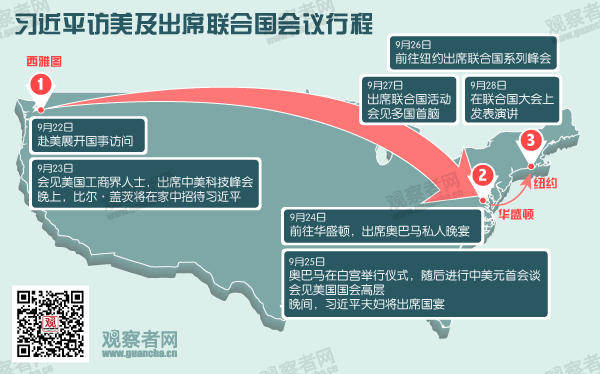 中国外交部9月16日正式公布习近平访美行程:“应美利坚合众国总统奥巴马邀请,国家主席习近平将于9月22日至9月25日对美国进行国事访问。应联合国秘书长潘基文邀请,国家主席习近平将于9月26日至9月28日赴纽约联合国总部出席联合国成立70周年系列峰会。”。同日,白宫发布声明公布习近平即将访美的消息,声明说,“习主席的访问将为美中在一系列共同关心的全球、地区和双边问题上扩展合作提供机会,也将使奥巴马总统和习主席能够就有分歧的领域发表建设性的看法。”