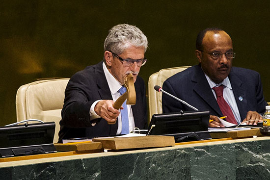图:新任联大主席吕克托夫特(左)15日宣布新一届会议开始/路透社