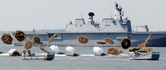 图:韩国军舰在演习中发射实弹/法新社