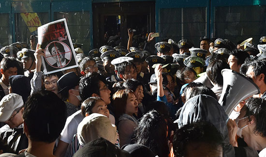 图:示威者16日晚冒雨在国会外反安倍政府/法新社