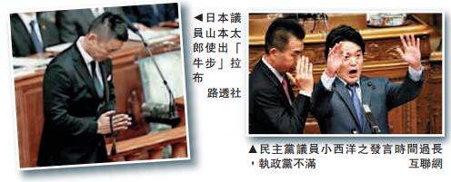 图:日本议员山本太郎使出“牛步”拉布/路透社