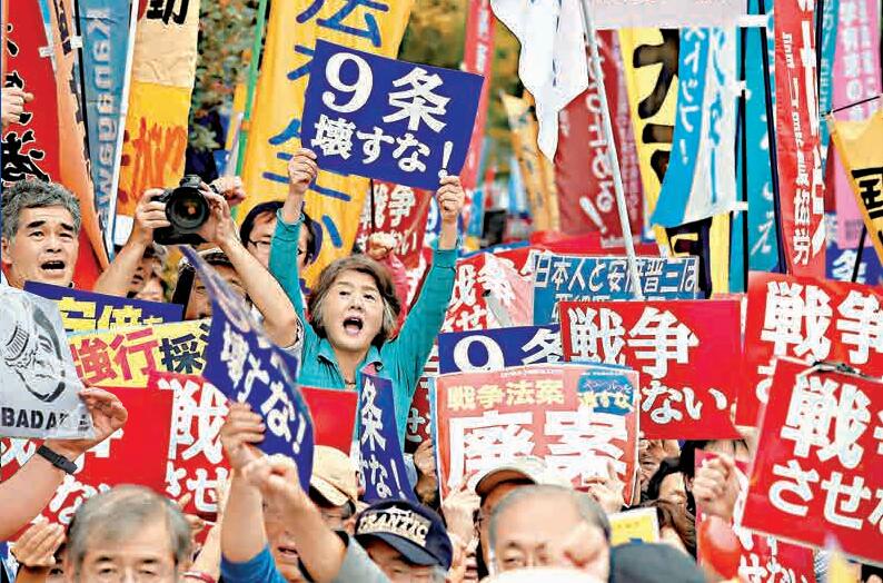 安保法案引发日本民众连日来大规模抗议,他们表示这项法案违背70年来所奉行的和平宪法,并可能使日本卷入美国所领导的战争。法案进入最终审议的18日,日本国会前的示威抗议集会也逐渐白热化,警方出动大批防暴警察及警员待命。继16日有13名过激的抗议人士因妨碍公务被警方逮捕之后,18日又有多名示威群众因对机动队员施暴被捕,还多次发生安保赞成派和反对派群众互呛、对冲的紧张对立场面。主办方表示,18日示威人数达到4万人。这些和平示威者,虽然不动武,但是他们的行动在55年前曾成功拉安倍外公岸信介下台。