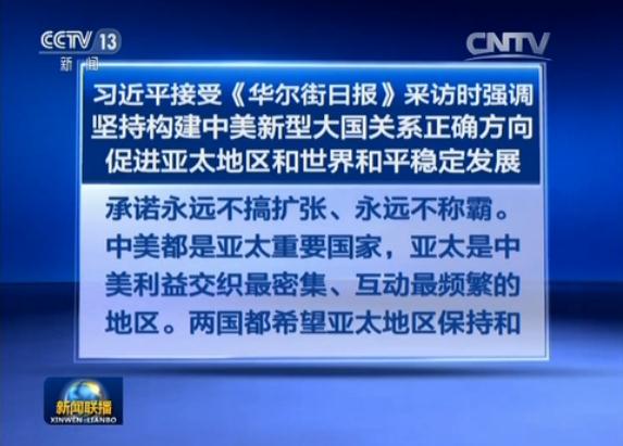 央视网消息(新闻联播):在对美国进行国事访问前夕,国家主席习近平9月22日接受了美国《华尔街日报》书面采访,就中美关系、两国在亚太及国际地区事务中的合作、两国人民交往、完善全球治理体系、中国经济形势、中国全面深化改革、外国企业在华投资、中国互联网政策、反腐败等回答了提问。