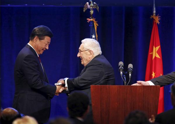 当地时间9月22日,中国国家主席习近平在西雅图威斯汀酒店举行华盛顿州政府和美国友好团体联合举办的欢迎晚宴,期间与美国前国务卿基辛格握手。
