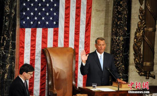 当地时间1月6日,美国新一届国会在首都华盛顿国会山开幕,上届众议长博纳击败对手成功连任。图为博纳宣誓就职。中新社发张蔚然摄