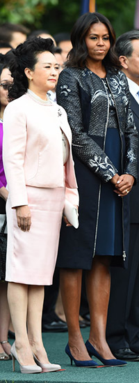 大公网9月26日综合报道:美中元首将于今天晚间(华盛顿时间25日)举行正式晚宴,两国的第一夫人米歇尔和彭丽媛届时着装风格也成为媒体关注焦点。《华盛顿邮报》记者猜测,若要配合中国主题,米歇尔可能会选择中国风的华裔设计师。